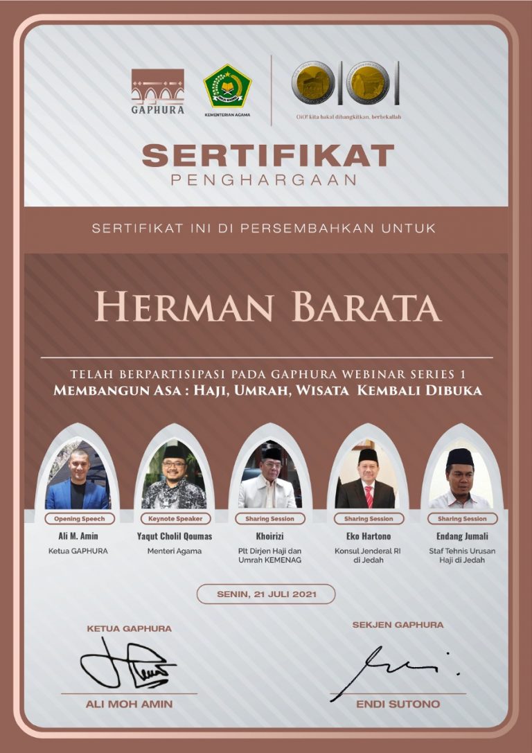 GAPHURA telah menerbitkan sertifikat bagi para peserta yang mengikuti acara Webinar Seri 1…….. Bagi peserta yang telah mengikuti kegiatan tersebut akan dikirimkan oleh CS GAPHURA Event melalui masing-masing WA yang terdaftar di Customer Service GAPHURA. Bagi yang belum mendapatkannya bisa langsung menghubungi 0812 832 21121